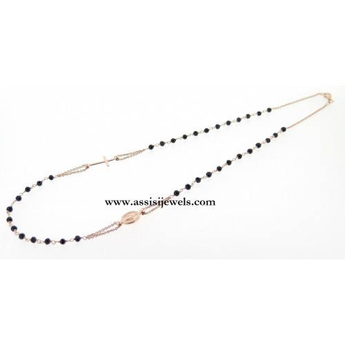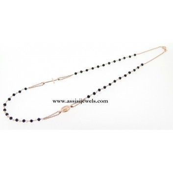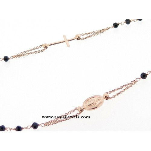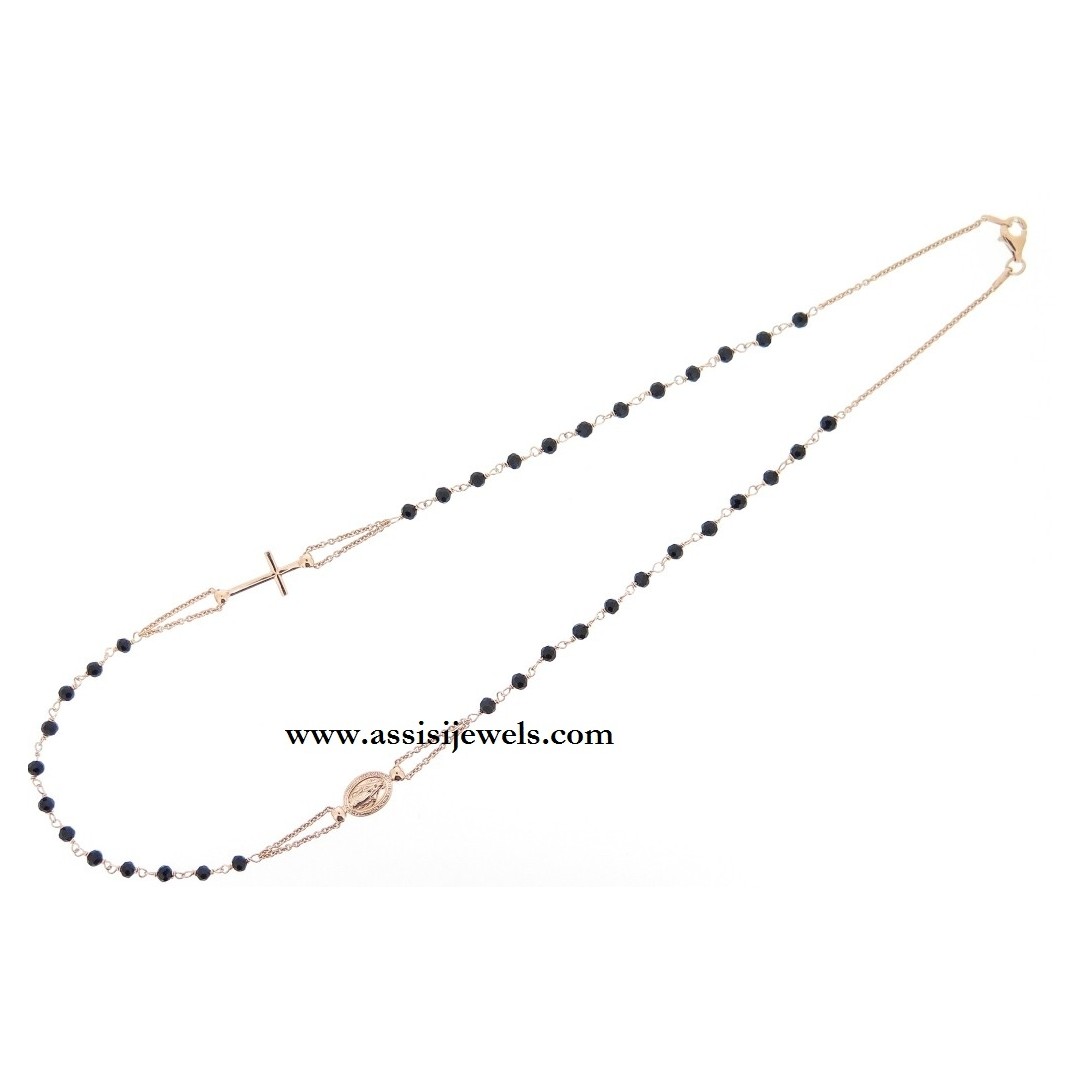 Collana ROSARIO in argento 925 placcato oro rosa 22 Kt con grani in onice sfaccettato, medaglia della Madonna Miracolosa e croce finale liscia
