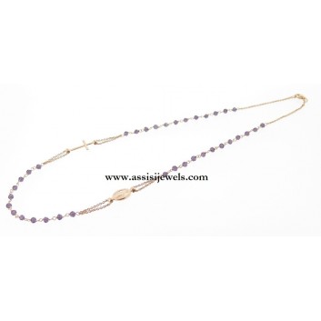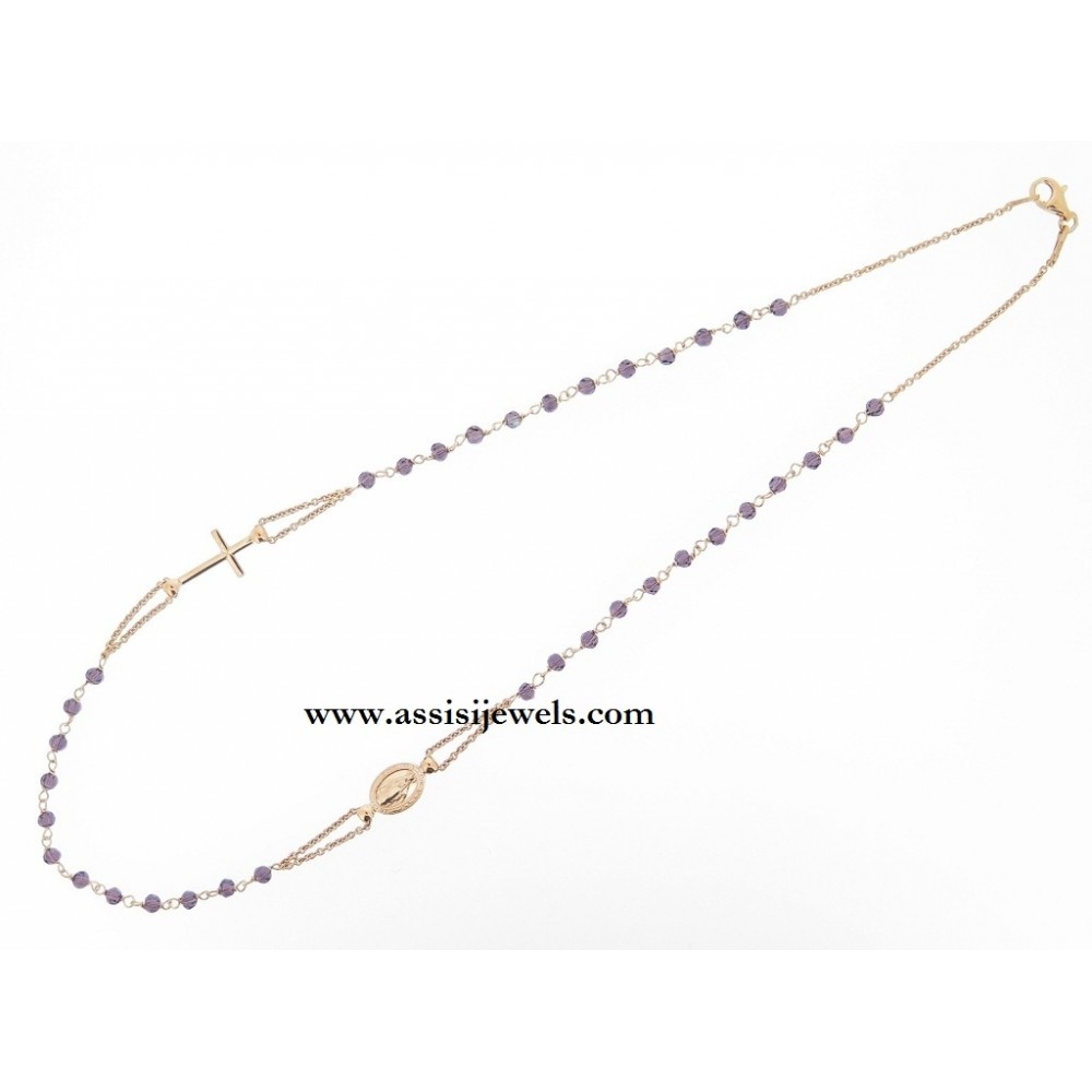 Collana ROSARIO in argento 925 placcato oro rosa 22 Kt con grani in cristallo ametista sfaccettato, medaglia della Madonna Miracolosa e croce finale liscia