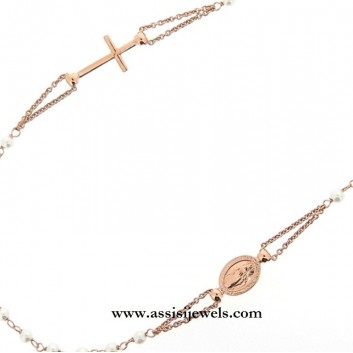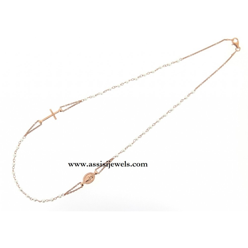 Collana ROSARIO in argento 925 placcato oro rosa 22 Kt con grani di perle, medaglia della Madonna Miracolosa e croce finale liscia