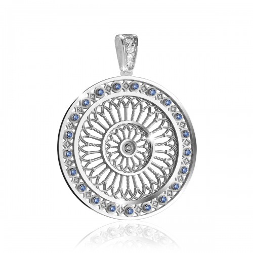 Pendente HUMILIS AQUA in argento 925 rodiato con zirconi bianchi e blu zaffiro, raffigurante il rosone della basilica di Santa Chiara di Assisi.