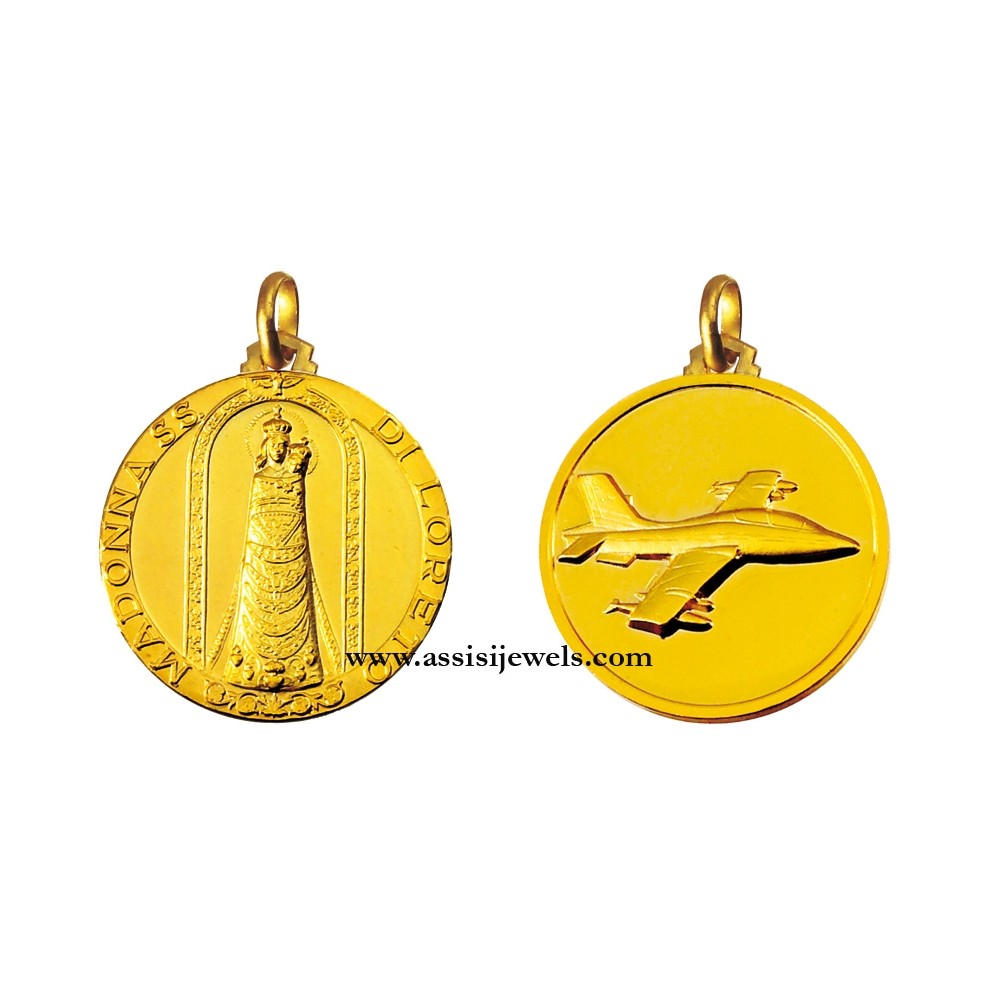 Medaglia doppia faccia con Madonna di Loreto ed Aereo in oro giallo 18 Kt (selezionare il diametro desiderato per conoscere il prezzo corrispondente)