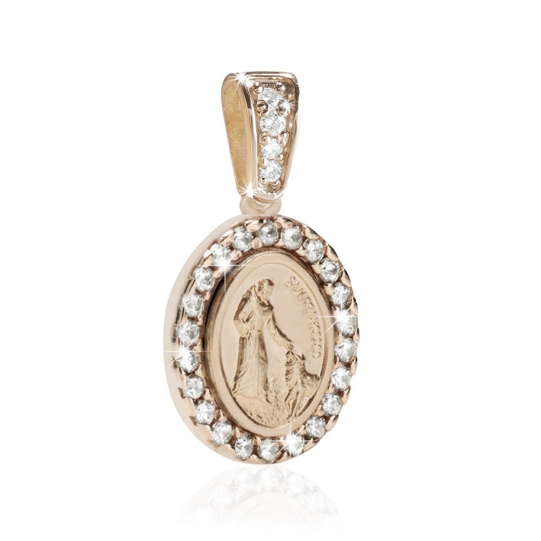 Medaglia di San Francesco con il lupo in oro rosa 18kt con zirconi.