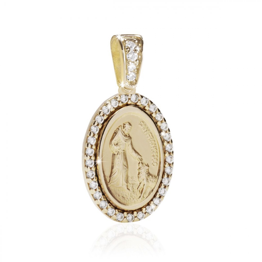 Medaglia di San Francesco con il lupo in oro giallo 18kt con zirconi.