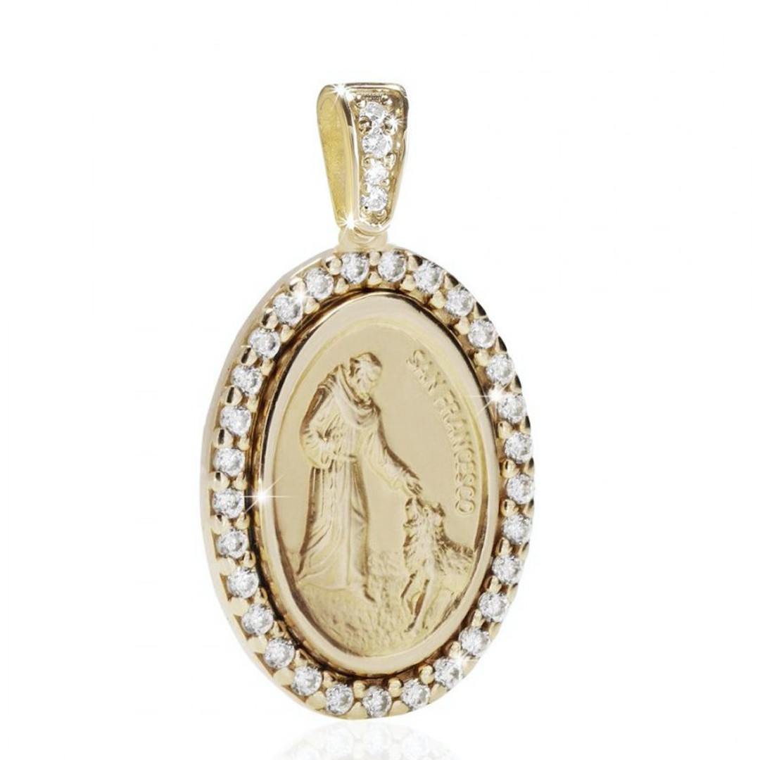 Medaglia di San Francesco con il lupo in argento 925 placcato oro giallo 24Kt con zirconi.