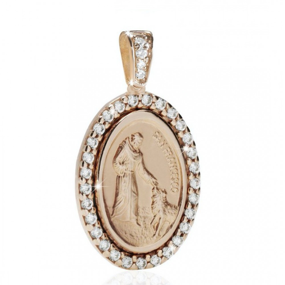 Medaglia di San Francesco con il lupo in argento 925 placcato oro rosa 22Kt con zirconi.