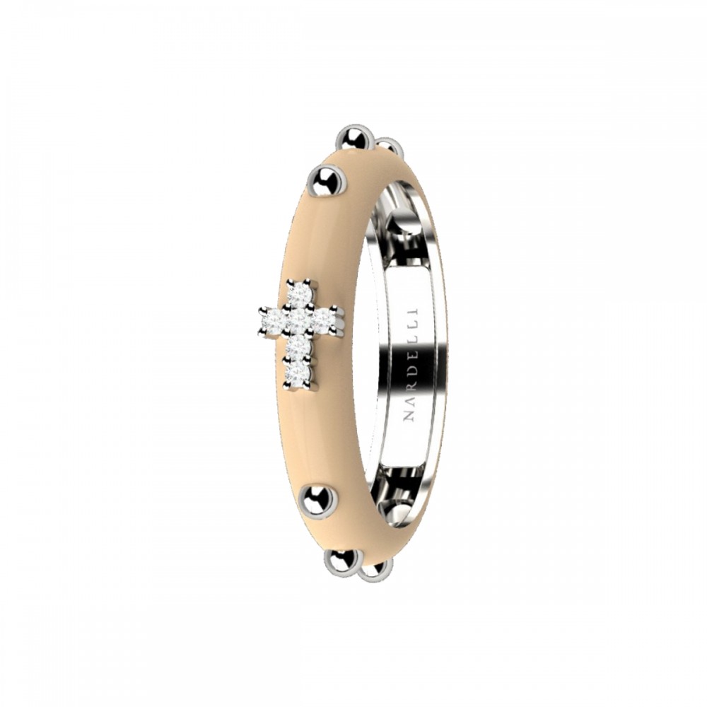 NARDELLI Anello rosario in oro bianco 9 Kt e smalto colorato, croce con diamanti bianchi taglio brillante  0.03 Kt interamente realizzato a mano