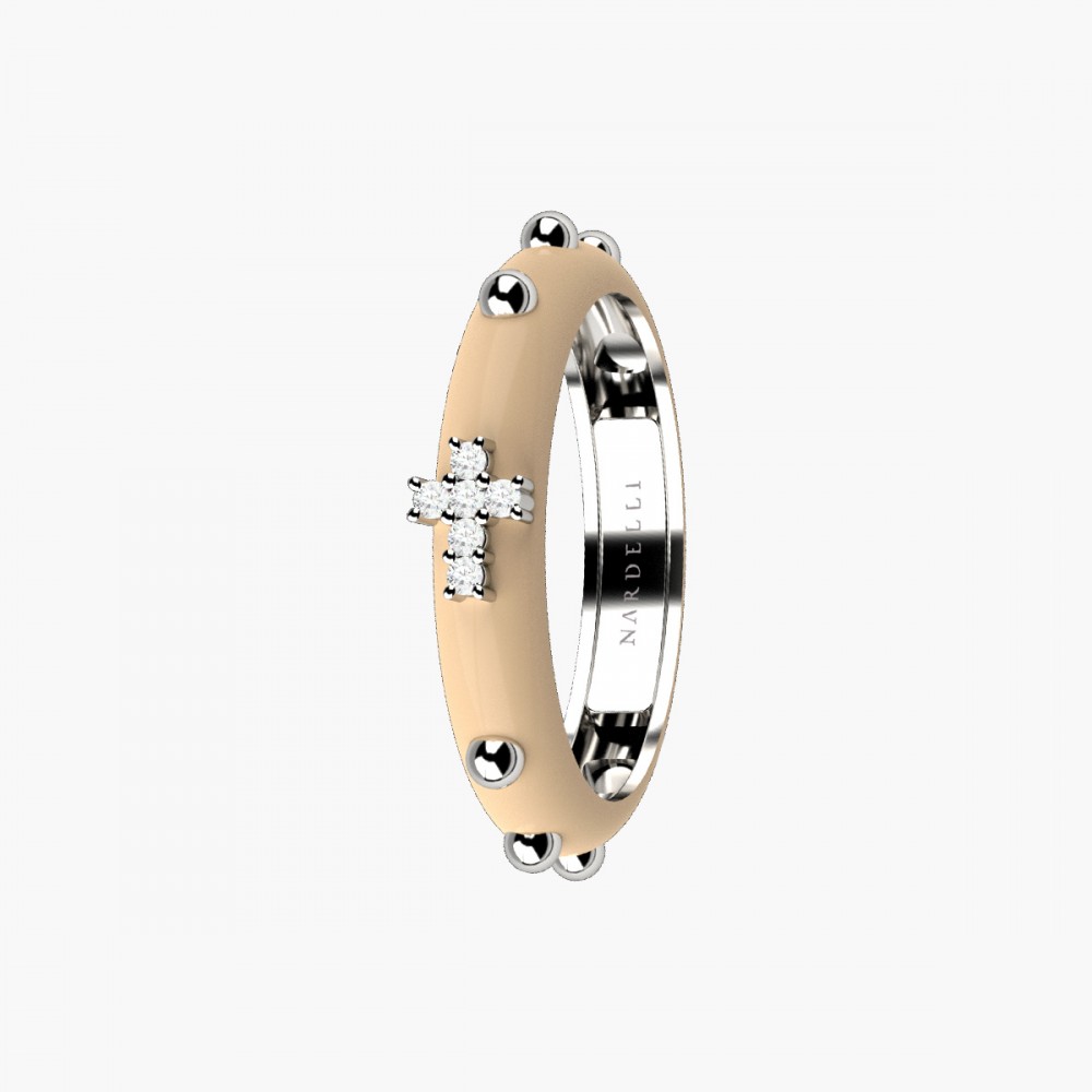 NARDELLI Anello rosario in oro bianco 9 Kt e smalto colorato, croce con diamanti bianchi taglio brillante  0.03 Kt interamente realizzato a mano