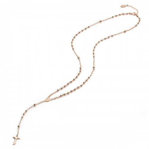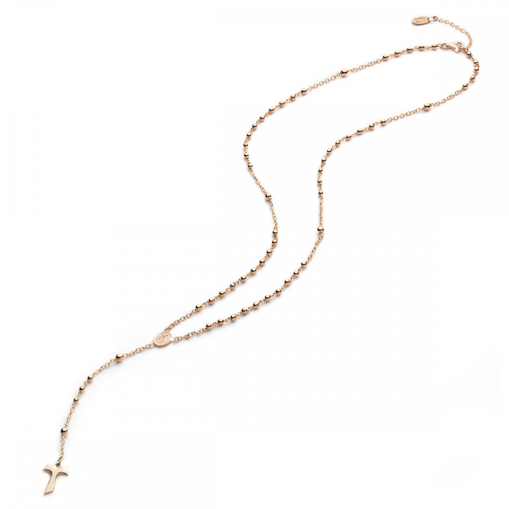 Collana ROSARIO in argento 925 placcato oro rosa 22kt con medaglia raffigurante San Francesco con il lupo e croce Tau pendente.
