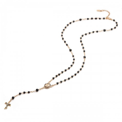 Collana ROSARIO double face in argento 925 placcato oro rosa 22kt con grani in onice, medaglia raffigurante da un lato la Madonna Miracolosa e dall'altro San Francesco con il lupo, con croce finale Tau pendente. Medaglia e croce con pavè di zirconi ambo i lati.