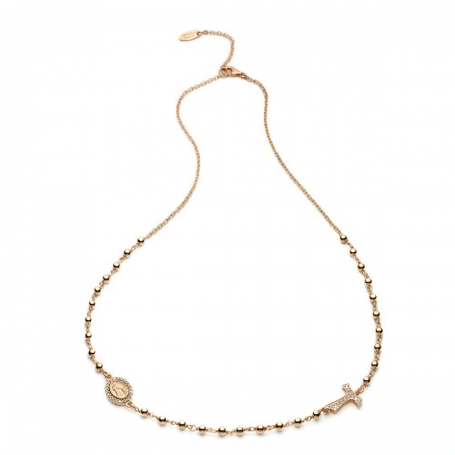 Collana ROSARIO double face in argento 925 placcato oro rosa 22kt con medaglia raffigurante da un lato la Madonna Miracolosa e dall'altro San Francesco con il lupo, con croce Tau. Medaglia e croce con pavè di zirconi ambo i lati.