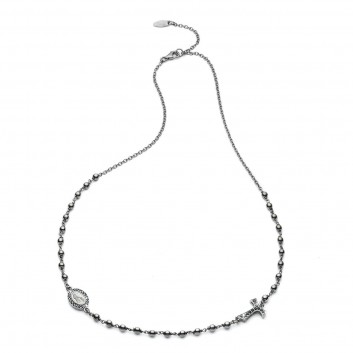 Collana ROSARIO double face in argento 925 rodiato con medaglia raffigurante da un lato la Madonna Miracolosa e dall'altro San Francesco con il lupo, con croce finale Tau pendente. Medaglia e croce con pavè di zirconi ambo i lati.
