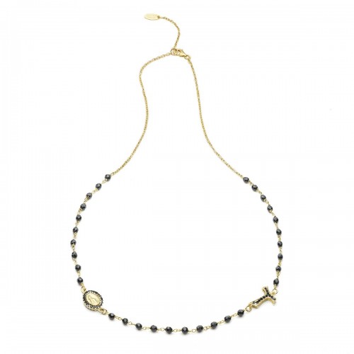 Collana ROSARIO double face in argento 925 placcato oro giallo 24kt con grani in onice, medaglia raffigurante da un lato la Madonna Miracolosa e dall'altro San Francesco con il lupo, con croce Tau. Medaglia e croce con pavè di zirconi ambo i lati.