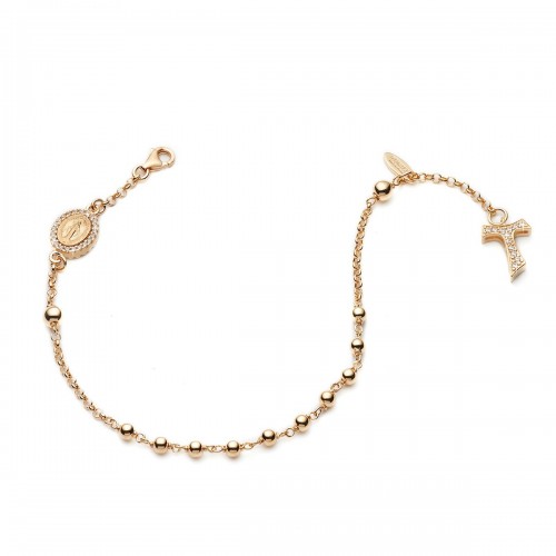 Bracciale ROSARIO double face in argento 925 placcato oro rosa 22kt con medaglia raffigurante da un lato la Madonna Miracolosa e dall'altro San Francesco con il lupo, con croce finale Tau pendente. Medaglia e croce con pavè di zirconi ambo i lati.
