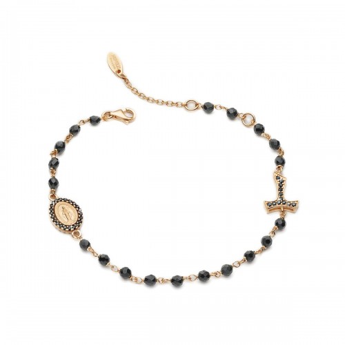Bracciale ROSARIO double face in argento 925 placcato oro rosa 22kt, con grani in onice, croce Tau e medaglia raffigurante da un lato la Madonna Miracolosa e dall'altro San Francesco con il lupo. Medaglia e croce con pavè di zirconi ambo i lati.