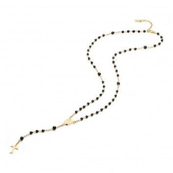 Collana ROSARIO in argento 925 placcato oro giallo 24 kt con grani in onice, croce Tau pendente e medaglia raffigurante San Francesco con il lupo.