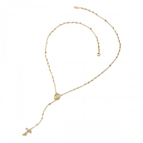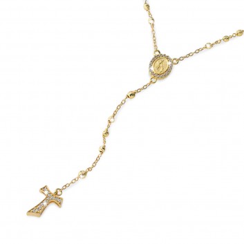 Collana ROSARIO double face in oro giallo 18kt con medaglia raffigurante da un lato la Madonna Miracolosa e dall'altro San Francesco con il lupo, con croce finale Tau pendente. Medaglia e croce con pavè di zirconi ambo i lati.