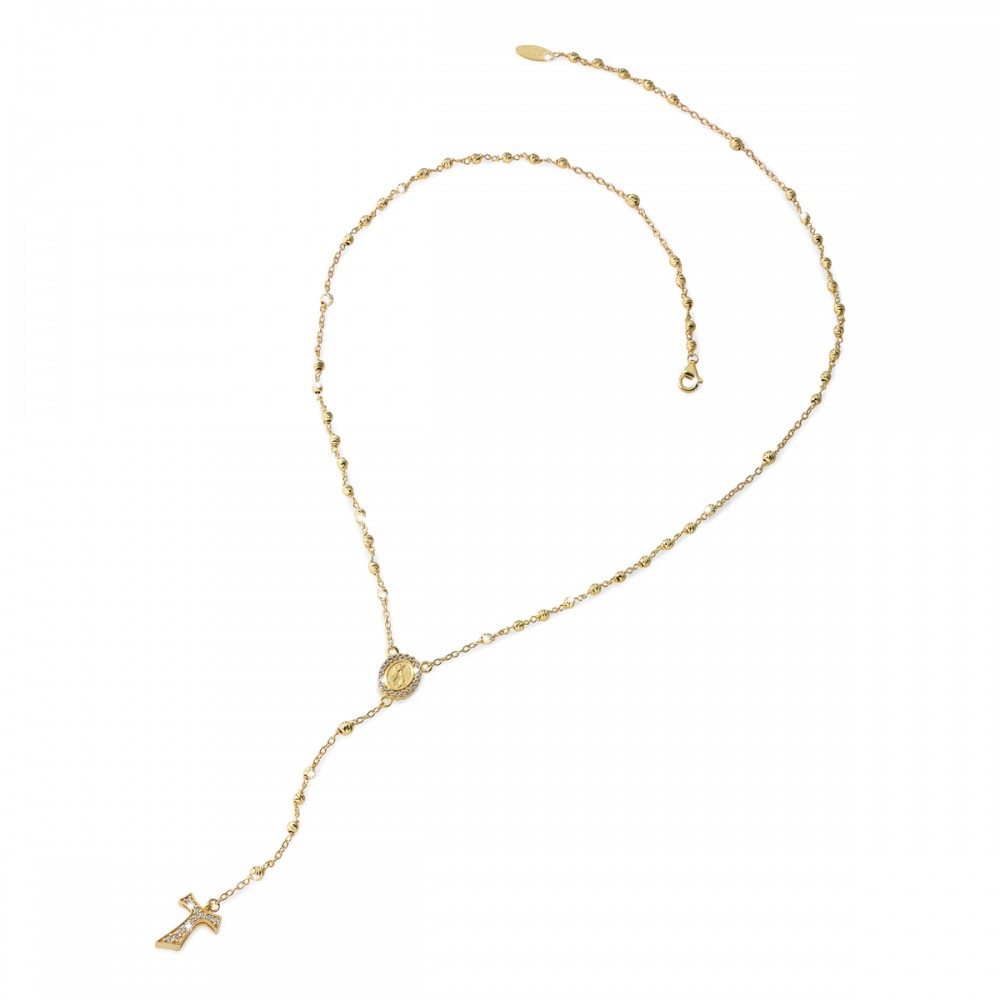 Collana ROSARIO double face in argento 925 placcato oro giallo 24kt con medaglia raffigurante da un lato la Madonna Miracolosa e dall'altro San Francesco con il lupo, con croce Tau. Medaglia e croce con pavè di zirconi ambo i lati.
