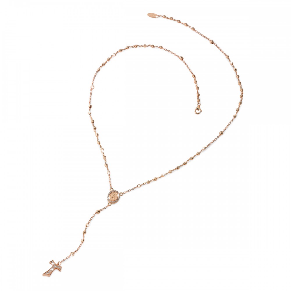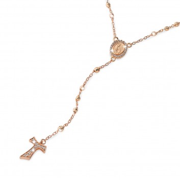 Collana ROSARIO double face in oro rosa 18kt con medaglia raffigurante da un lato la Madonna Miracolosa e dall'altro San Francesco con il lupo, con croce finale Tau pendente. Medaglia e croce con pavè di zirconi ambo i lati.