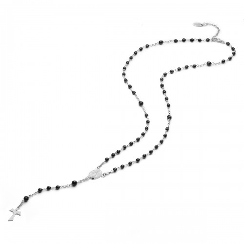 Collana ROSARIO double face in argento 925 rodiato con medaglia raffigurante da un lato la Madonna Miracolosa e dall'altro San Francesco con il lupo, con croce Tau. Medaglia e croce con pavè di zirconi ambo i lati.