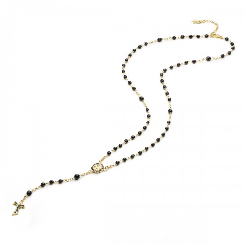 Collana ROSARIO double face in argento 925 placcato oro rosa 22kt con grani in onice, medaglia raffigurante da un lato la Madonna Miracolosa e dall'altro San Francesco con il lupo, con croce Tau. Medaglia e croce con pavè di zirconi ambo i lati.