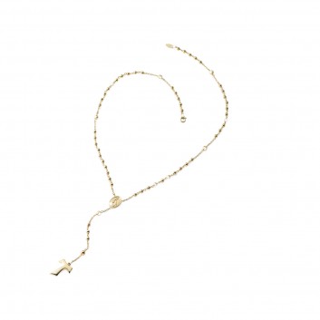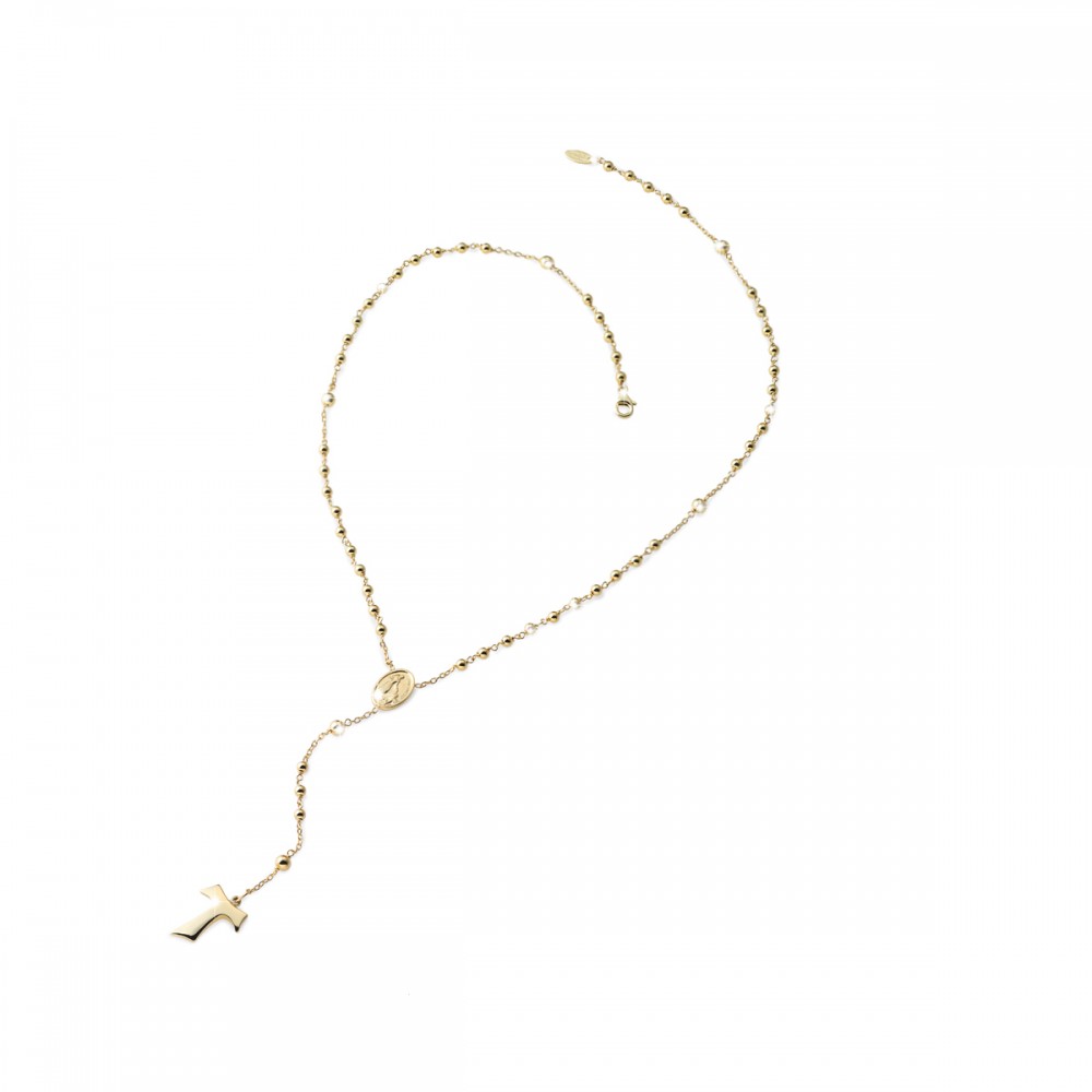 Collana ROSARIO double face in oro giallo 18kt con medaglia raffigurante da un lato la Madonna Miracolosa e dall'altro San Francesco con il lupo, con croce finale Tau pendente.