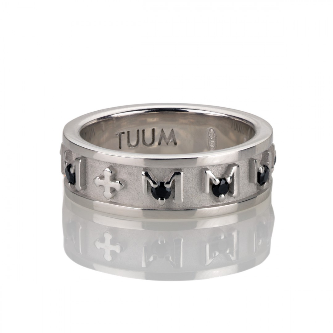 Anello TUAM in argento 925 rodiato con preghiera dell'Ave Maria in lingua latina e diamanti neri.