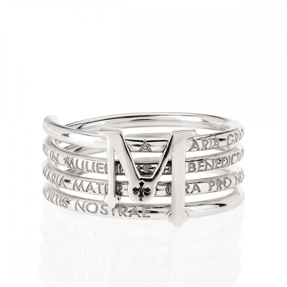 TUAM X è la perfetta fusione tra le forti origini e le coerenti evoluzioni di stile e di design che hanno condotto TUUM ad un primo ed importante traguardo: l’anno X. Una spirale di parole che scorrono lungo la sua lunghezza. Un fiume di lettere che iniziano con Maria Gratia Plena. Al centro troneggia l’iconica M, l’omaggio di TUUM alle forze generatrici del mondo: M di Mater, M di Maria, M di Mondo. L’abbraccio della M non è un caso ma rappresenta il sentimento che ogni gioiello TUUM evoca nelle persone. Un’armonia di linee morbide e sinuose che incontrano la solidità e la forza del capolettera creando un anello elegante, molto raffinato, in metalli nobili come l’argento e l’oro.