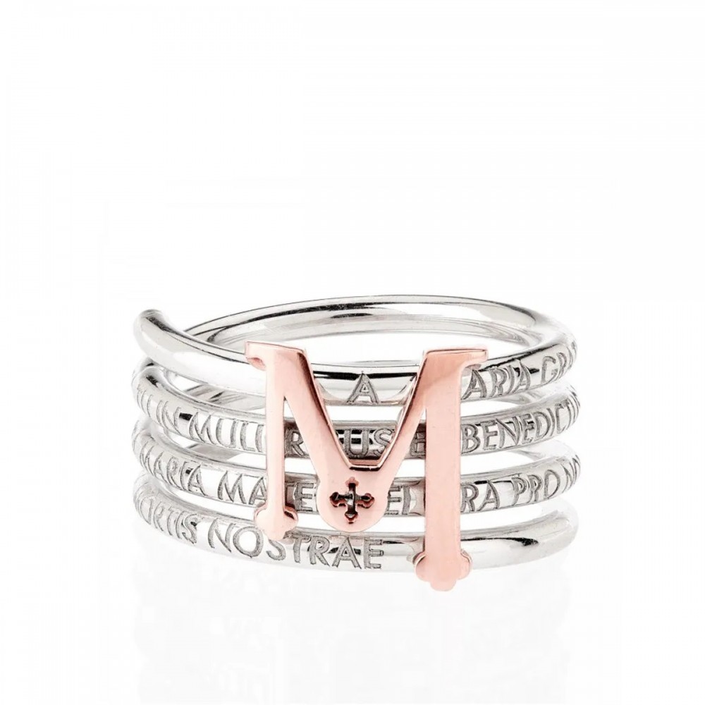 TUAM X è la perfetta fusione tra le forti origini e le coerenti evoluzioni di stile e di design che hanno condotto TUUM ad un primo ed importante traguardo: l’anno X. Una spirale di parole che scorrono lungo la sua lunghezza. Un fiume di lettere che iniziano con Maria Gratia Plena. Al centro troneggia l’iconica M, l’omaggio di TUUM alle forze generatrici del mondo: M di Mater, M di Maria, M di Mondo. L’abbraccio della M non è un caso ma rappresenta il sentimento che ogni gioiello TUUM evoca nelle persone. Un’armonia di linee morbide e sinuose che incontrano la solidità e la forza del capolettera creando un anello elegante, molto raffinato, in metalli nobili come l’argento e l’oro.
