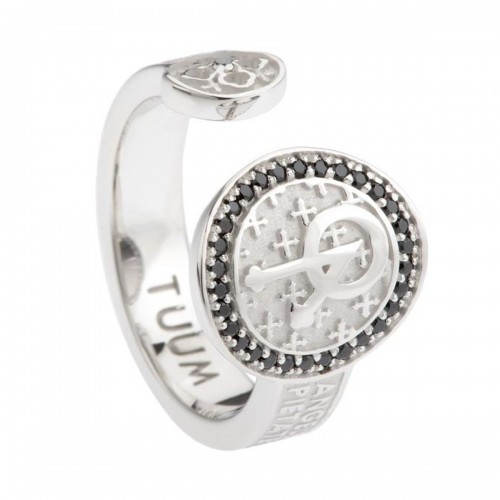 Anello TUUM INFINITUM in argento 925 rodiato con spinelli neri e preghiera dell'Angelo di Dio in lingua latina